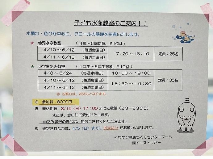 子供水泳教室のお知らせです